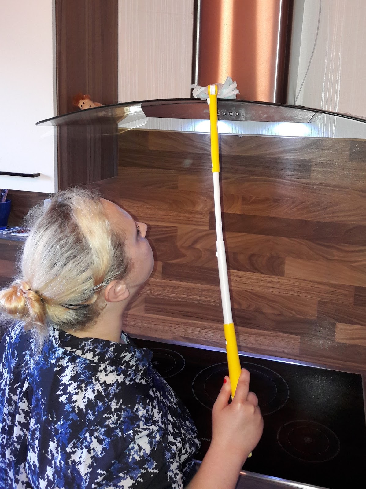 Aber selbst der mega hohe Küchenschrank, der schon seit Monaten keinen Lappen gesehen hat, ist jetzt gar kein Problem mehr (siehe unten). Oder auch oben mal eben Spinnenweben an der Decke zu entfernen, geht super leicht damit: